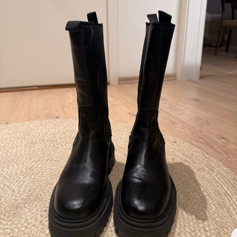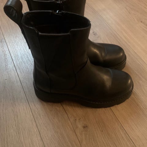 Vagabond støvler i størrelse 39, laget av svart skinn. Støvlene har en solid gummisåle med godt mønster for grep. Innvendig er de foret med mykt materiale for ekstra komfort og varme.