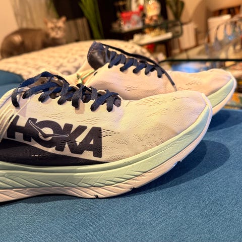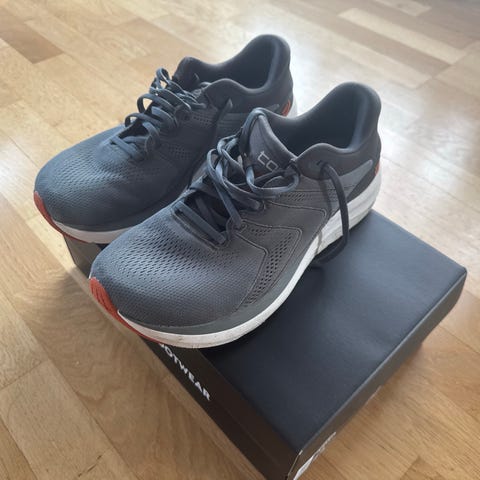 Hoka One One løpesko i størrelse 43, farge svart. Egnet for løping med dempende såle og pustende materiale.
