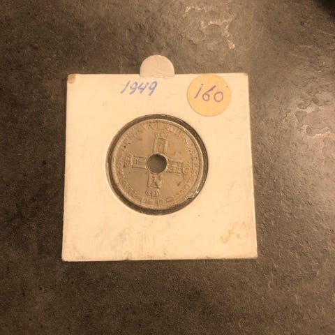 Australia Three Pence mynt fra 1951 med motiv av en V-formet kornaks på forsiden og portrett av kong Georg VI på baksiden.