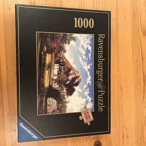 Ravensburger Puzzle med 500 biter som viser et landskap med blomstrende trær, en rød hytte og fjord i bakgrunnen. Puslespillet er laget av papp og passer for voksne og barn.