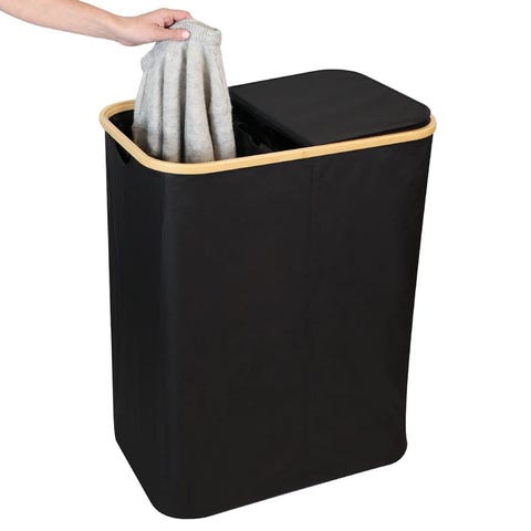 Vaskebøtte med hvitt stoff og sammenleggbar ramme i lyst materiale. Egnet for oppbevaring av klær eller annet tøy.50 kr