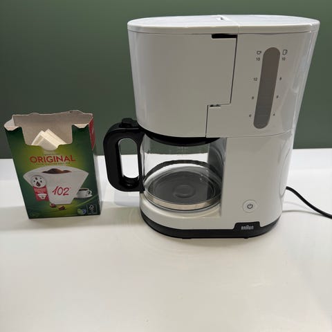 Braun kaffetrakter i hvit farge. Kaffetrakteren har en glasskanne med kapasitet opp til 10 kopper. Vannivåindikator på siden for enkel påfylling.