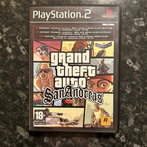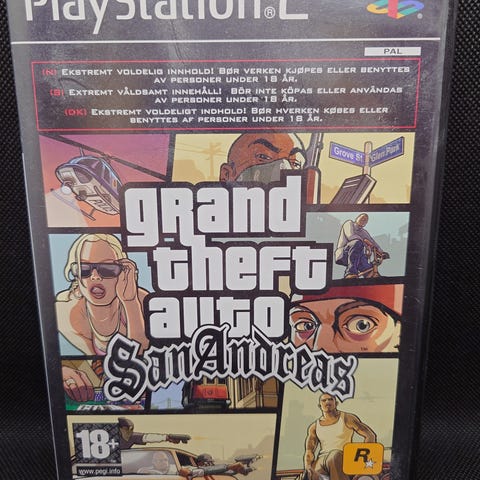 Rockstar Games Grand Theft Auto San Andreas er et Playstation 2-spill. Inkluderer spilldisk, spillomslag og en lokal guidebok. Spillet har aldersgrense 18 år.