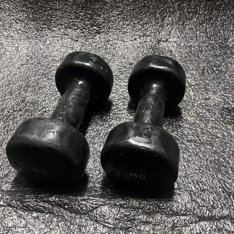 Selger et par manualer på 4 kg per stykk, totalt 8 kg. Passer fint til hjemmetrening, oppvarming, lett styrketrening eller rehabilitering. Hantlene har godt grep og er lite brukt, med normal bruksslitasje. Egner seg både for nybegynnere og for deg som vil ha lettere vekter som supplement til trening.