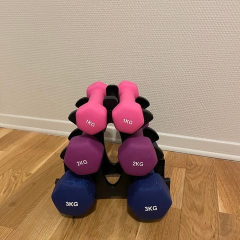 Selger flere par manualer i forskjellige vekter, perfekt for hjemmetrening, oppvarming, rehabilitering eller lett styrketrening. Hantlene er gummibelagte, behagelige å holde i og ligger stabilt på gulvet. Passer godt både for nybegynnere og viderekomne, og er fine til øvelser for armer, skuldre, bryst og generell styrke. Finnes i 1 kg (rosa), 2 kg (blå) og 3 kg (lilla), selges som par eller samlet etter avtale. Normal bruksslitasje, men fullt funksjonelle.