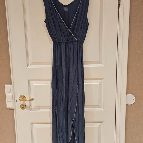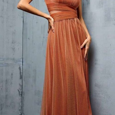 Stilen er klassisk, feminin og sofistikert, med en lett sexy touch på grunn av splitten og den åpne ryggen.