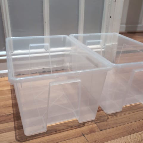 oppbevaringsboks i hvit plast. Boksene har håndtak på siden for enkel bæring og er egnet for oppbevaring av ulike gjenstander i hjemmet.