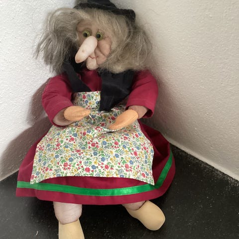 Håndlaget dukke med klær i stoff, inkludert kjole med blomstermønster og rutete forkle. Dukken holder en kost og har briller. Passer som dekorasjon eller samleobjekt.