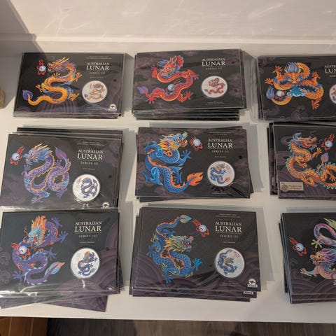 1 uåpnet kasse med 2021 Silver Dragon Coin Bar 200 stk i kassen. Er utrolig populære blant bullion samlere for sin fantastiske design. Denne 2021 Silver Dragon Coin Bar er laget med .9999 rent sølv og veier 1 troy oz. Denne strålende usirkulerte sølvmyntstangen har også en pålydende verdi på $ 1. Med et begrenset preg på bare 250 000