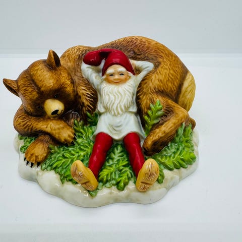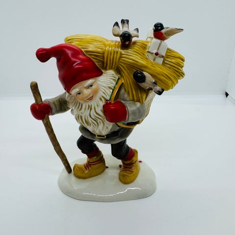 Sjarmerende og stemningsfull figur fra Lars Carlssons Nissegård-serie, designet for Firkløveren. Figuren forestiller en klassisk, gammeldags nisse på skitur med sekk, ski og staver- Figuren er helt og pen uten nag eller mangler.
