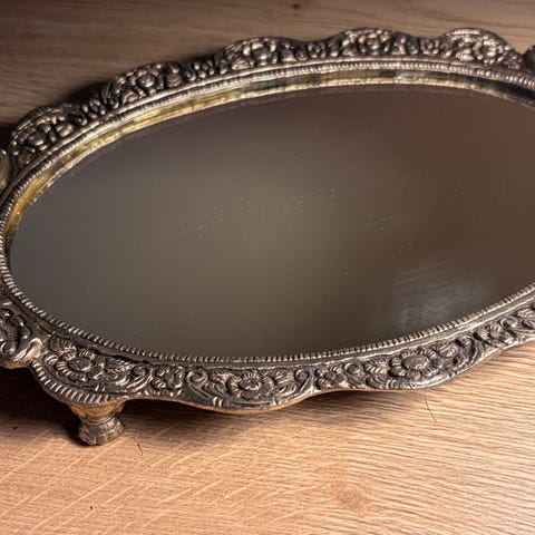 Håndlaget speil med liten kurv for oppbevaring.