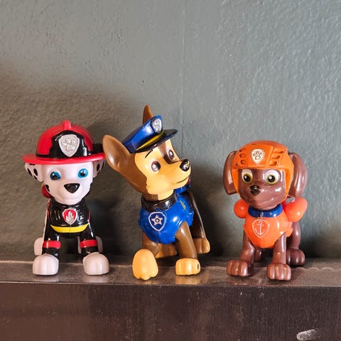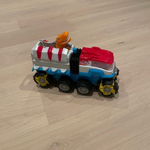 Paw Patrol leketøysbil med tilhørende dinosaurfigur og Paw Patrol-figur. Leken består av en stor bil med flere hjul og detaljer, samt en oransje dinosaur. Egnet for barn som liker rollelek med kjente karakterer. På dinosauren er et av bein limt fordi det falt, ellers er leken svært lite brukt.