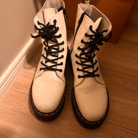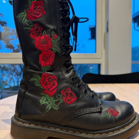 Dr. Martens støvler i størrelse 40, svart farge med broderte roser. Støvlene har en høy snøring, 14 hull.