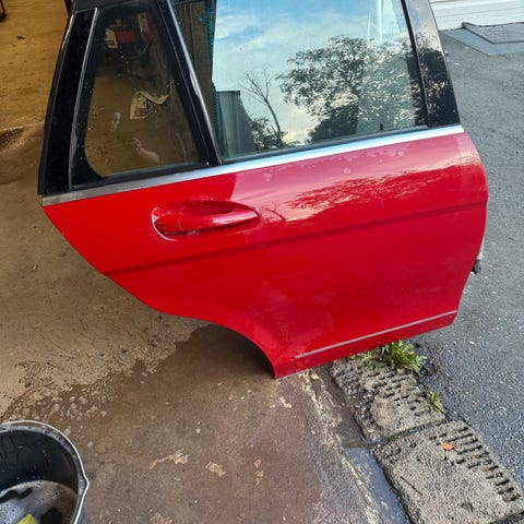 Mercedes-Benz dør og bakluke i rød farge. Passer til modell med to dører, brukt bilkarosserideler.