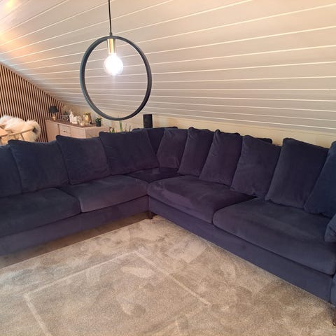 Selger en stor og fin lysebeige sofa med sjeselong.