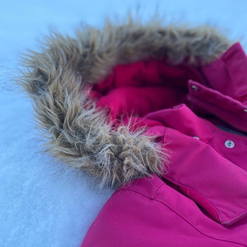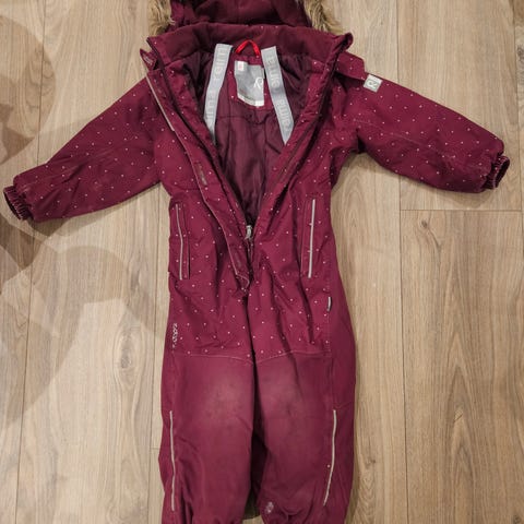Reima tec vinterdress i størrelse 110 for jenter, laget av polyester. Plagget har lilla farge og er designet for barn i farta på vinteren. Den har en liten rift i venstre arm (se bilde). Ellers lite slitasje på rumpe og knær. Begge strikker under bena inntakt. Vært veldig happy med kvaliteten på denne dressen.
