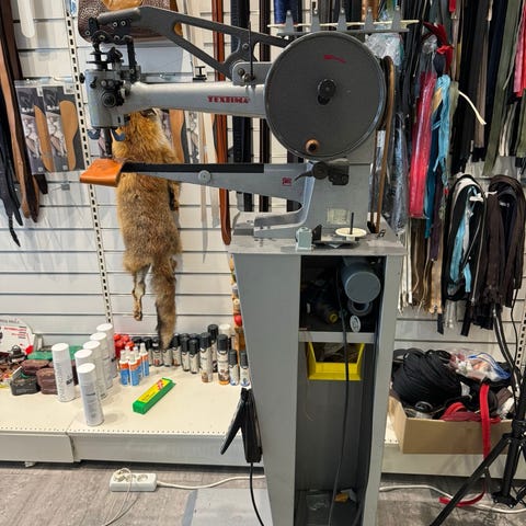 Brother industrisymaskin med overlockfunksjon. Maskinen er montert på et bord med fotpedal og motor. Har aldri testet den så vet ikke tilstand .