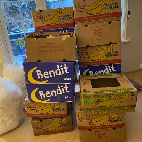 5 bananesker gis bort og må hentes.