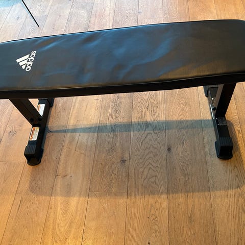 Adidas treningsbenk med tilhørende vektstang og vektskiver. Benken har polstret ryggstøtte med Adidas-logo. Egnet for styrketrening og vektløfting hjemme.