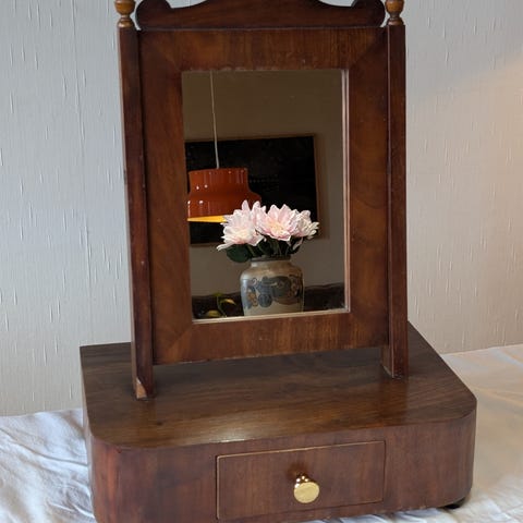 Vakkert og originalt piketitter i tre, trolig fra perioden ca. 1920. Klassisk design med dreide detaljer og buet speilramme. Pikespeilet har to skuffer med originale knotter og god oppbevaringsplass. Speilet er i pen stand og gir et fint, mykt uttrykk.