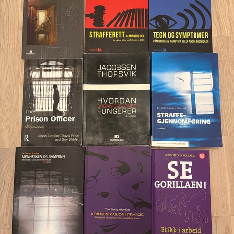En samling av ulike fagbøker fra fengselsbetjent utdanningen. Jus, kriminologi, risiko- og sårbarhetsvurdering, konflikthåndtering og relaterte emner. Bøkene inkluderer forskjellige titler som omhandler strafferett, konflikthåndtering, kommunikasjon i praksis, refleksjonshåndbøker og etikk i arbeidslivet. Formatene er hovedsakelig pocketutgaver. Bøkene er egnet for studenter.