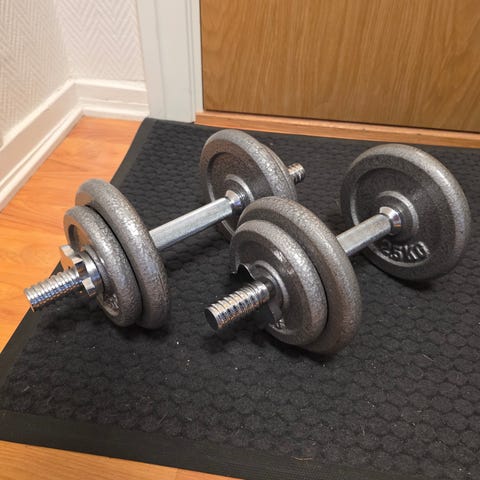 Sett med to justerbare manualer med flere vektskiver. Manualene har metallstenger og plastbelagte vektskiver som kan tilpasses i vekt etter behov. Egnet for styrketrening og generell trening hjemme eller på treningssenter.