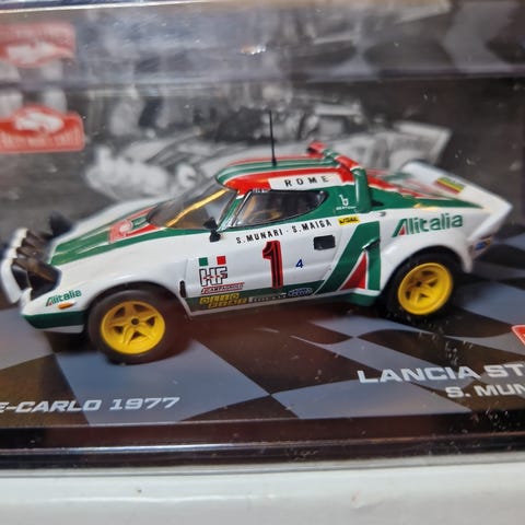 Selger en herlig Lancia Stratos modellbil i skala 1:43, hvit med Alitalia dekor slik den ble kjørt av Sandro Munari da han vant Rally Monte Carlo i 1977. Modellen er ny i eske, og er egnet for samling eller utstilling.