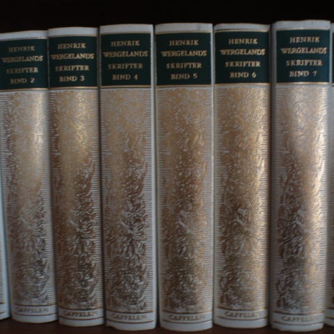 Selger samlingen Henrik Wergeland - Skrifter i udvalg 1.-4. fra 1897-1898. Prisen på annonsen er for alle bøkene