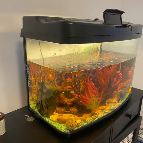 Akvariumet er pent brukt, har noen riper som nesten ikke syntes, dette gjør ikke noe med funksjonen. Det er 60l