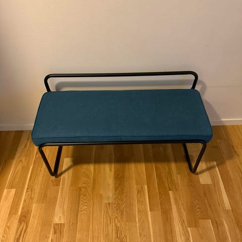 En vakker lav benk med myk stopping. Frisk cherise rosa farge og sorte ben.