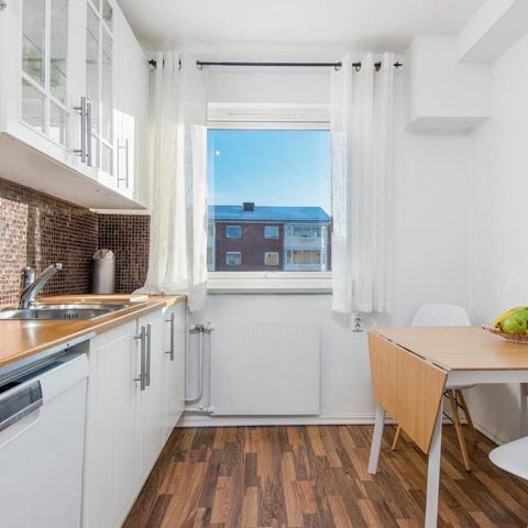 Kjøkkeninnredning fra Ikea (ca 20 år gammelrt) med hvite skapdører og skuffer, utstyrt med glassdører på overskap. Benkeplaten er i tre (laminat, ingen synlige skader) og kjøkkenet har integrert oppvaskkum og flere skuffeløsninger. Passer for standard kjøkkenoppsett med stor arbeidsflate og god oppbevaringsplass. Overskapene er 92 cm høye. De aller fleste skapdørene er hele og pene, men noen få dører og skuffer har begynt å miste laminatet (se bilder).