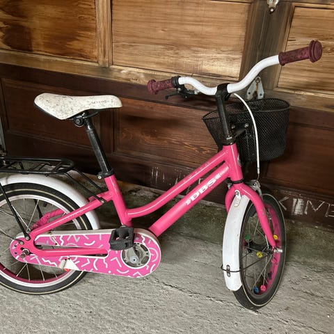 Baghera barnesykkel i rosa med hvite hjul og brun sete og håndtak. Sykkelen har en kurv foran i flettet materiale. Egnet for barn som ønsker å lære balanse og sykkelferdigheter.