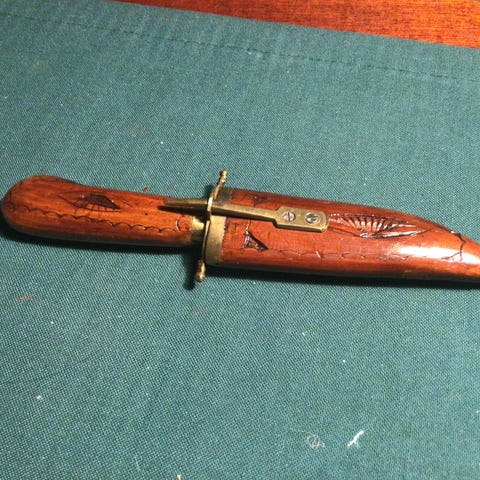 Kastekniv i svart med flere hull i bladet og håndtaket. Kniven har en rett, smal form og er designet for samling, ikke skarp. 3d printed