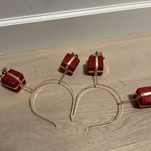 julepynt sett bestående av en rød nisselue med hvit kant og tekst, samt et par reinsdyrhorn med dekorative grønne og røde detaljer. Passer til bruk i desember som dekorasjon eller til kostymer.