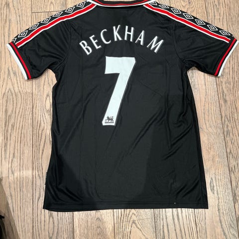Umbro Beckham fotballdrakt med langermet design i hvit farge. Størrelse L/XL (42/44). Drakten har nummer 7 og navnet Beckham på ryggen. Laget av pustende materiale egnet for fotballspill.