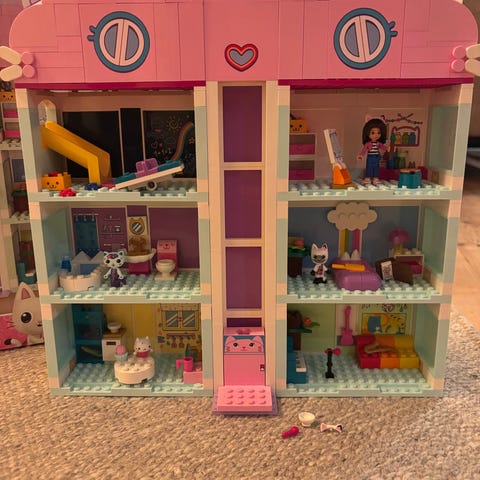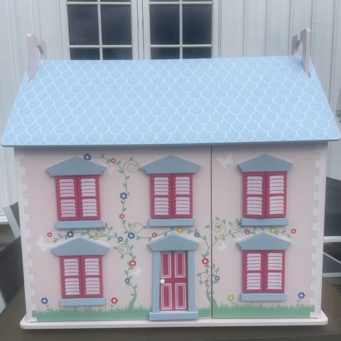Dukkehus med tilbehør. Selges 300 kr. Senga er gavvel ramlet av, fikses lett med lin :)