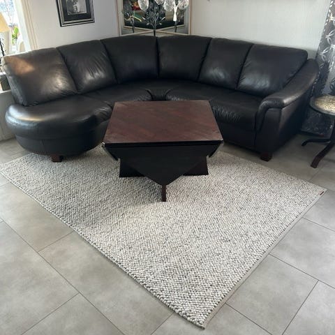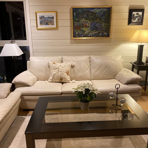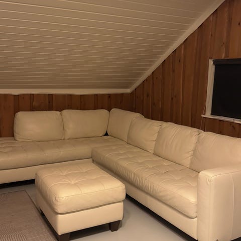 Pent brukt hjørnesofa i skinn selges. Den har 6 seter og er i brunt skinn. Ingen skader på skinnet, har for det meste stått ubrukt i en loftstue.