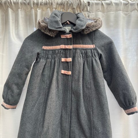 Veldig pent brukt kåpe fra Name it, størrelse 116. Farge mørk lilla med lyselilla prikker. Lilla fløyelsbånd rundt livet.