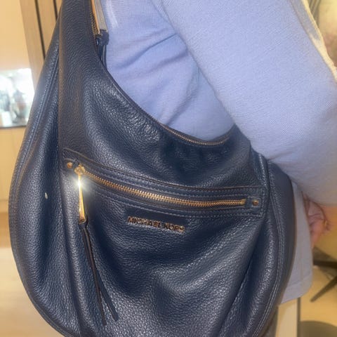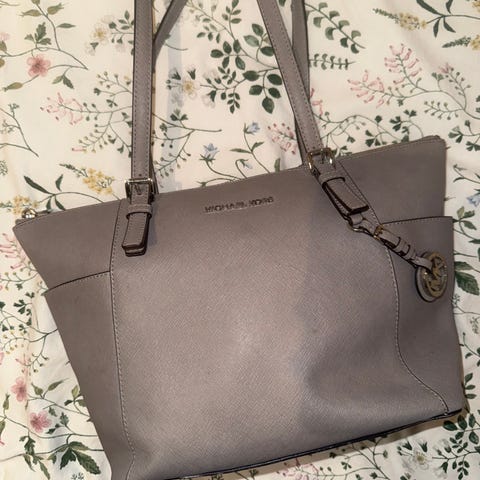Michael Kors skulderveske i lær for dame. Vesken har et romslig hovedrom med flere innerlommer, inkludert en med glidelås. Den har to skulderstropper og en dekorativ logoanheng. Vesken er lys grå i farge og egnet for daglig bruk. Den er slitt i håndtakene ellers helt fin uten feil. Hent gjerne