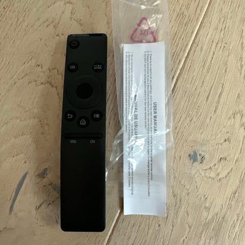 Samsung fjernkontroll med knapper for Netflix, Prime Video og Rakuten TV. Designet for å kontrollere Samsung smart-TV-er med enkel tilgang til strøm, volum, kanalvalg og navigasjon. Fargen er svart, laget i plastmateriale, og passer for generell bruk med Samsung TV.