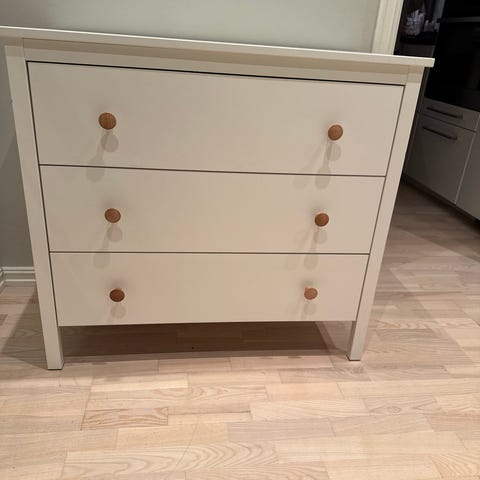 Kommoden har seks skuffer og er laget av materialer som gir et enkelt og funksjonelt design.