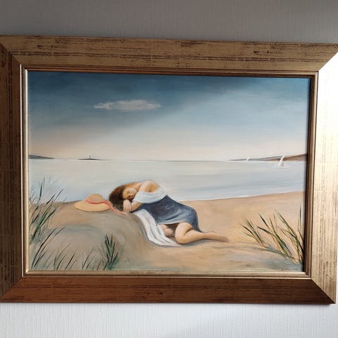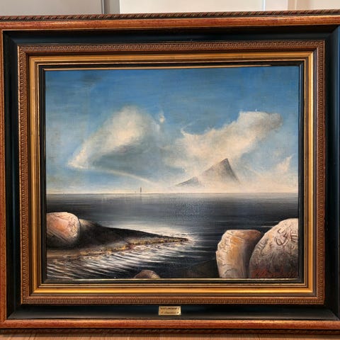 Maleri signert Ventimiglia 1951, motiv fra bylandskap. Maleriet er innrammet i en enkel treinnramming.