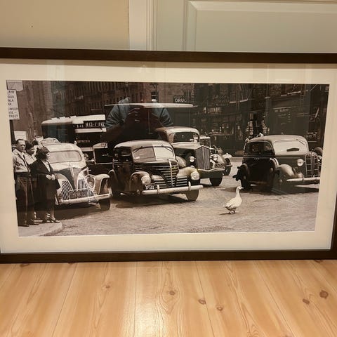 Veggbilde med svart-hvitt bymotiv, størrelse 140x100 cm. Bildet har ramme og viser en gate med trær, gatelys og bygninger i bakgrunnen.