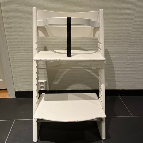 Stokke høy barnestol i gul farge med brunt sete. Kan både være høy stol ved bord, gyngestol med ratt og sete med bordplate. Setet er rimelig slitt og stolen har en del bruksmerker bl.a. på bordplaten.