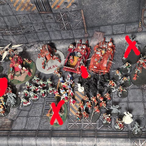Warhammer 40K Adeptus Mechanicus miniatyrfigurer i plast, håndmalt med maphiston rød og flere metallisk farger.