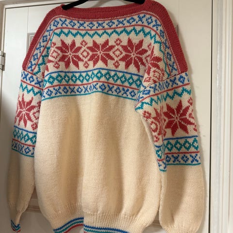 Nydelig hjemmestrikket ullgenser med tradisjonelt norsk mønster i rundfelling. Strikket i en dyp brunfarge med naturhvitt mønster – tidløs og lett å kombinere.