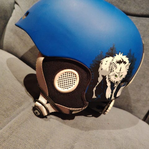 Jeg selger en brukt alpinhjelm med briller for 200,-kr