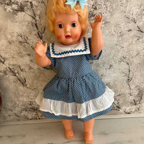 Dukke iført tradisjonelle norske bunadsklær med hvit bluse, svart skjørt med broderier og hvit forkle med blonder. Dukken har blondt hår og detaljerte klær som representerer norsk kulturarv. Må vaske klærne.