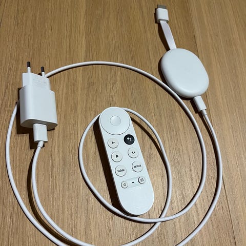 Google Chromecast medieavspiller for streaming av innhold til TV. Enheten kobles til via HDMI og støtter trådløs tilkobling for enkel overføring av video og lyd fra ulike enheter.