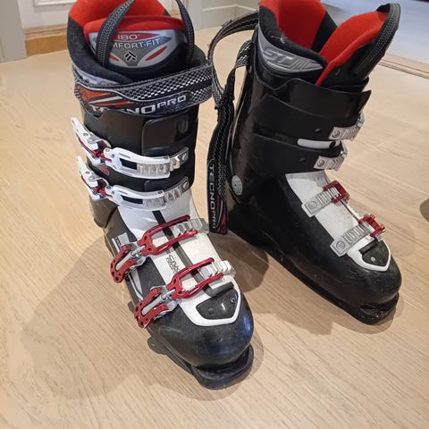 TechnoPro støvler selges. Usikker på størrelse; det står 250 / 275 støpt i plasten, og stemplet 265 i innersko. Utvendig lengde er 297mm.